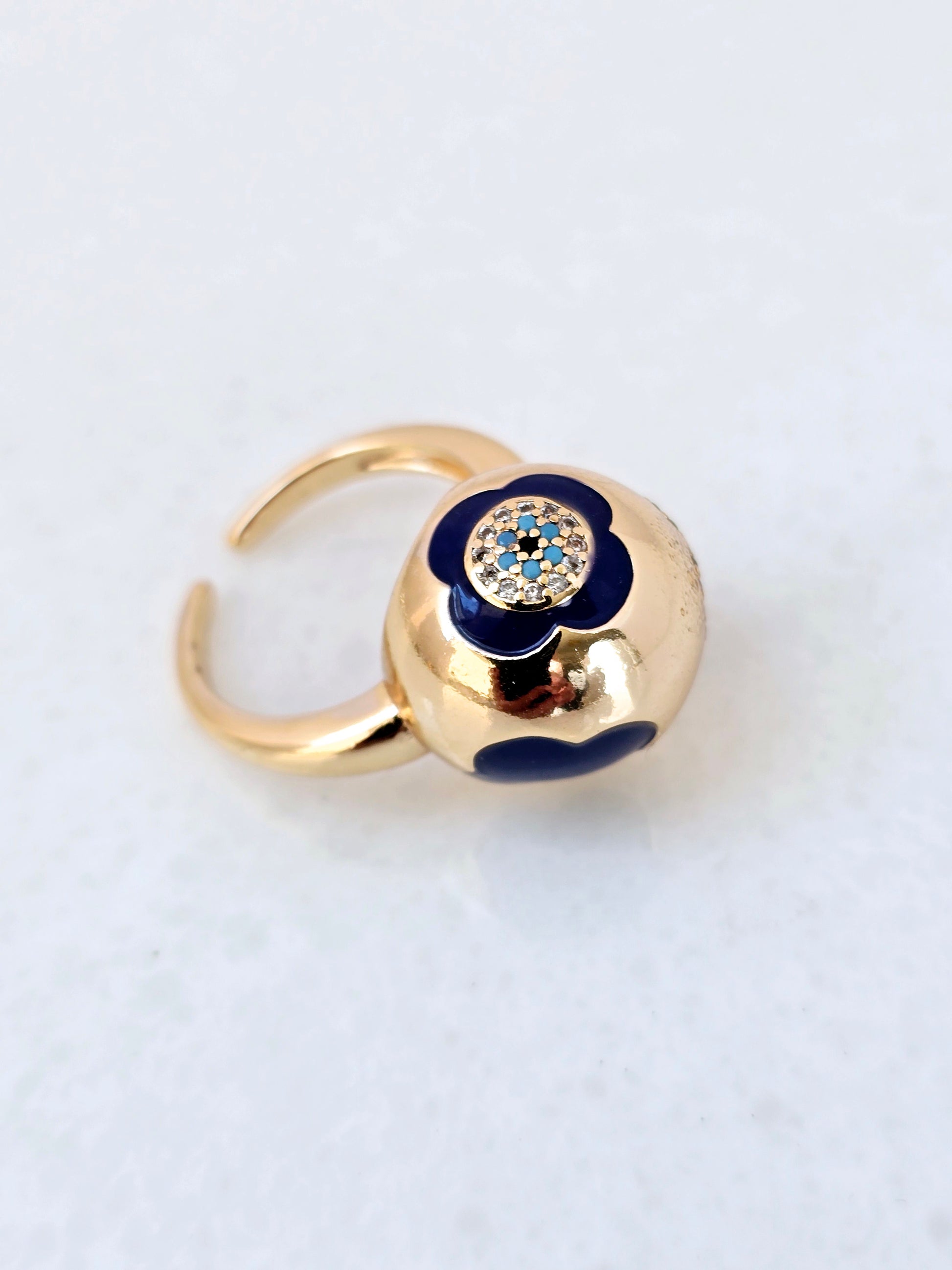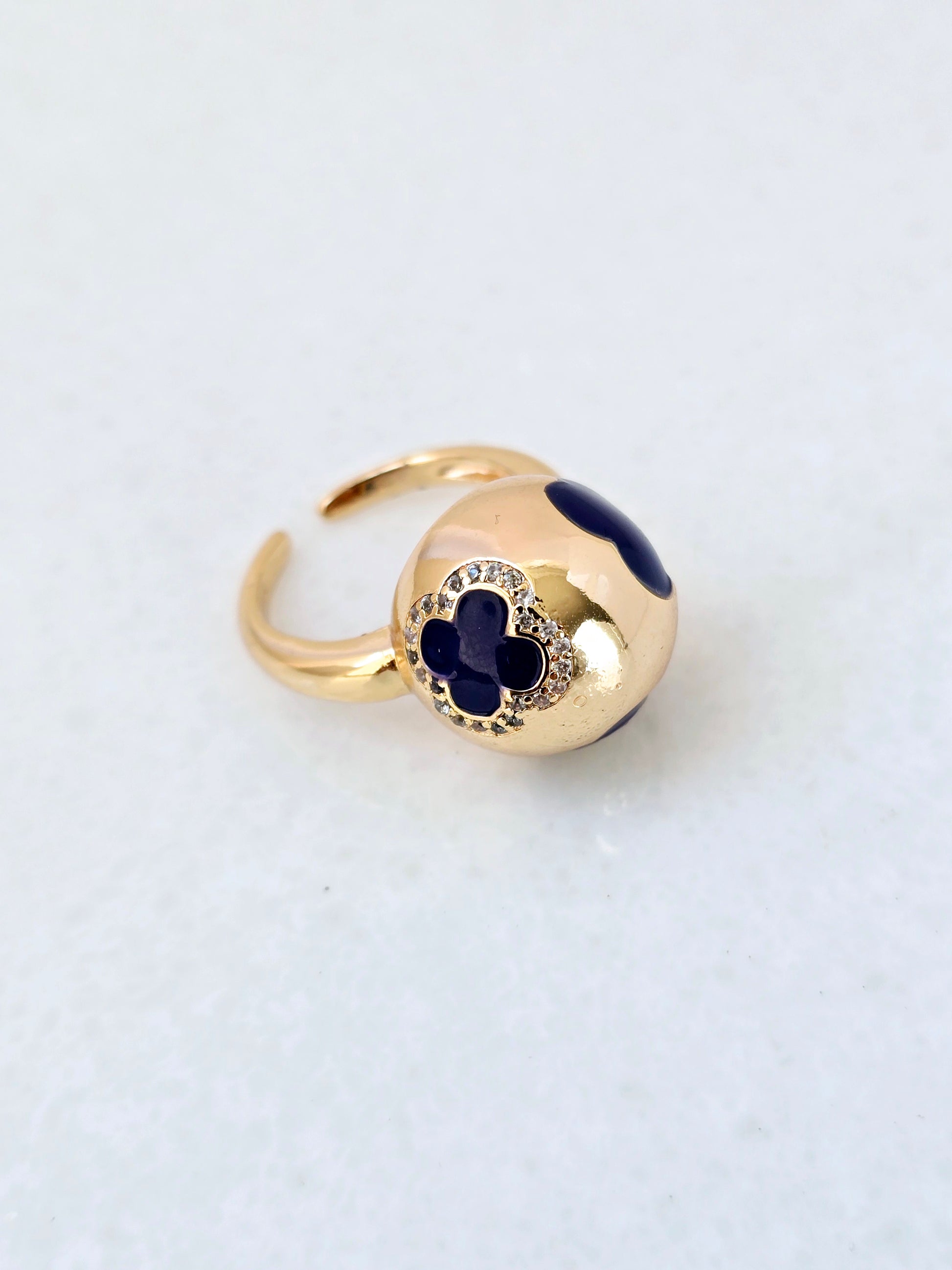 A thick golden ring embellished with a large round design in craved designed ball, Its bold design commanding attention with a captivating fusion of luxurious simplicity and statement-making elegance