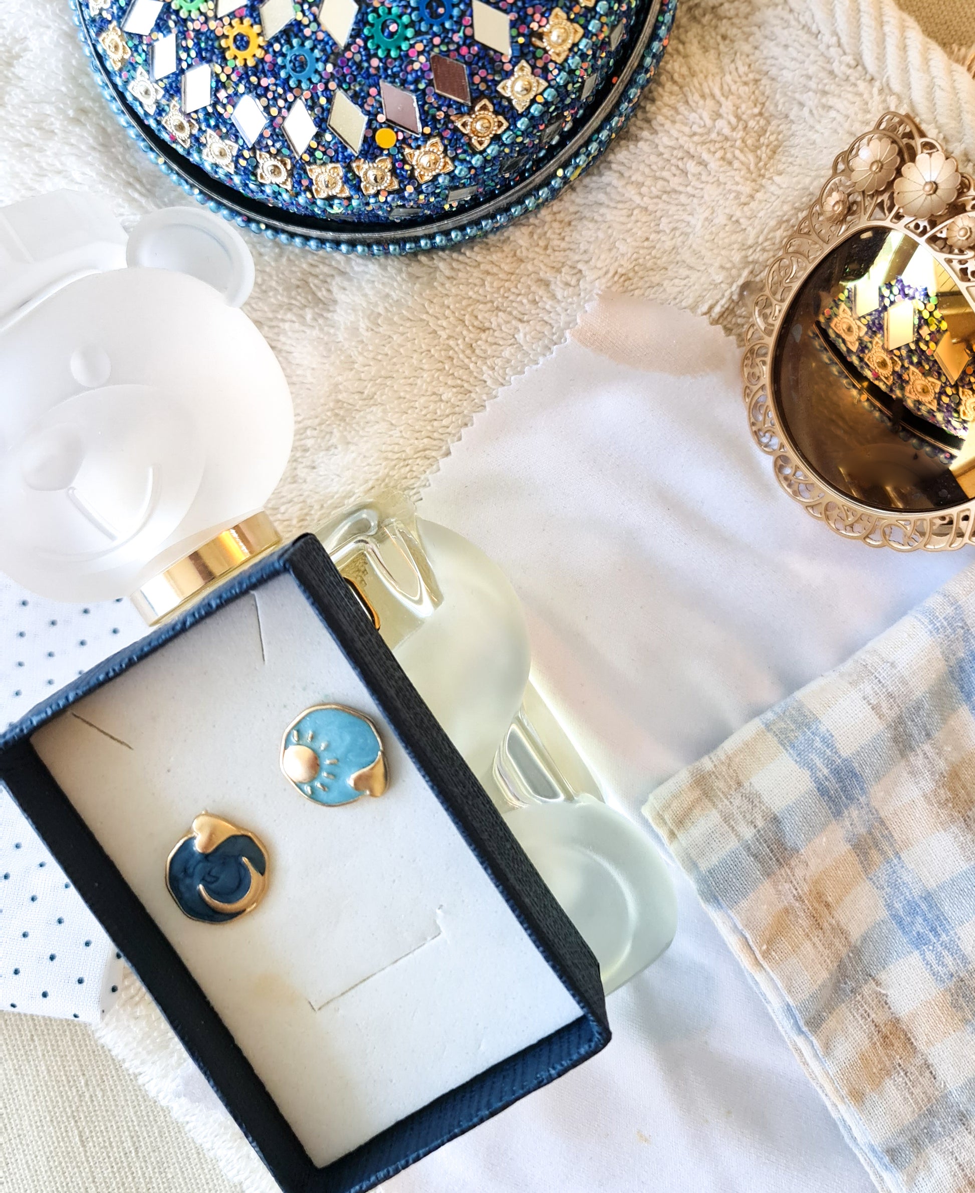 Blue stud earrings, a harmonious duo of shades; one a deep, mysterious navy, the other a gentle, shimmering sky blue with delicate golden drops, blending elegance with a hint of celestial allure for a captivating and versatile accessory ensemble.