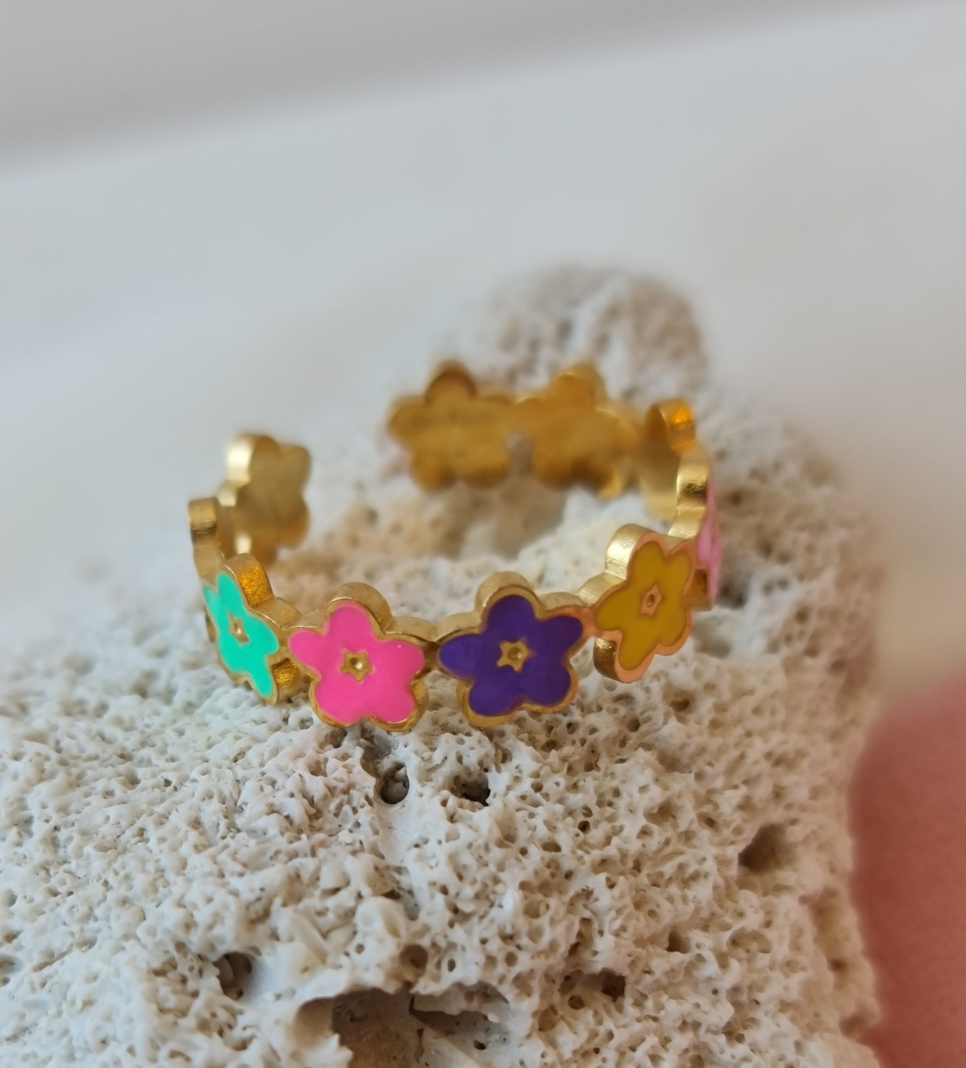 The charming gold ring features a vibrant floral design with colorful flowers in turquoise, pink, purple, and yellow, adding a playful touch to any outfit.
